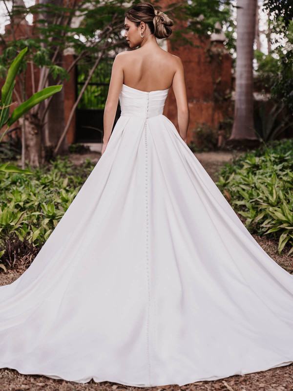 At Dimitra Designs, our curated collection showcases the incredible versatility of the A-line. You can explore this classic silhouette in a multitude of fabrics, from crisp, structured Mikado for a clean, modern look, to soft, flowing chiffon perfect for a romantic garden wedding. Whether you envision delicate lace details or a stunningly minimalist wedding dress, the A-line is the perfect canvas.