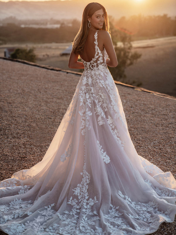 While both offer a classic bridal feel, an A-line gown provides significantly more freedom of movement. Its skirt flares out more gradually and has less volume than a ball gown, making it lighter and easier to navigate, sit, and dance in, which is perfect for a long and celebratory wedding day.