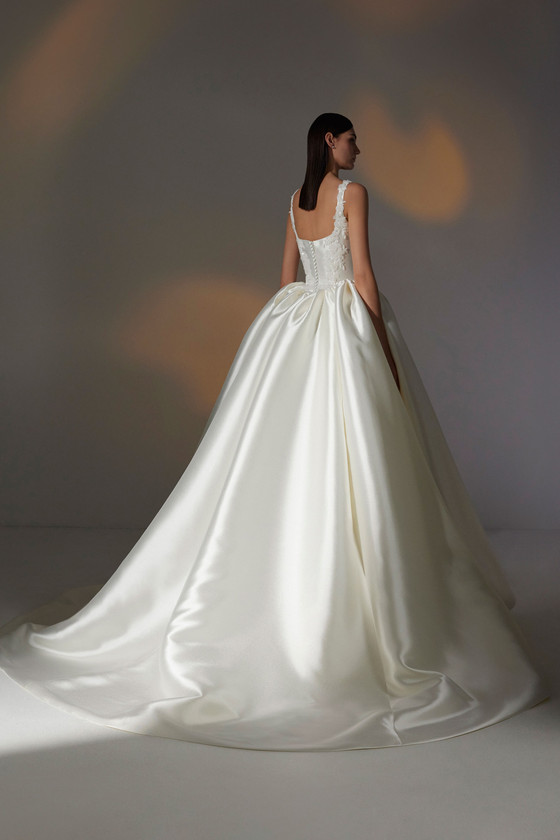 Mikado is a type of blended silk that is known for its substantial weight and a beautiful, subtle sheen. Unlike its shinier cousin, satin, Mikado has a more textured, twill-like finish that photographs beautifully, minimizing glare and highlighting the gown's architectural lines. Its inherent structure makes it a favorite among designers for creating clean, crisp silhouettes that require minimal embellishment to make a powerful statement.